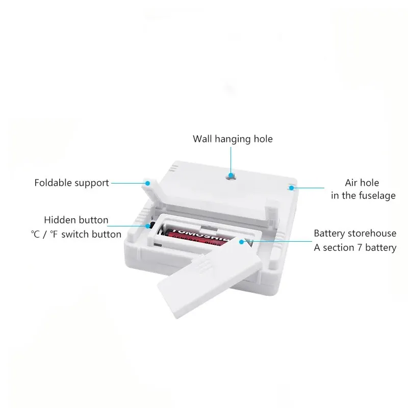 • On the back of the product, open the bracket, there is a black button behind, when you press it, you can switch to Fahrenheit temperature display